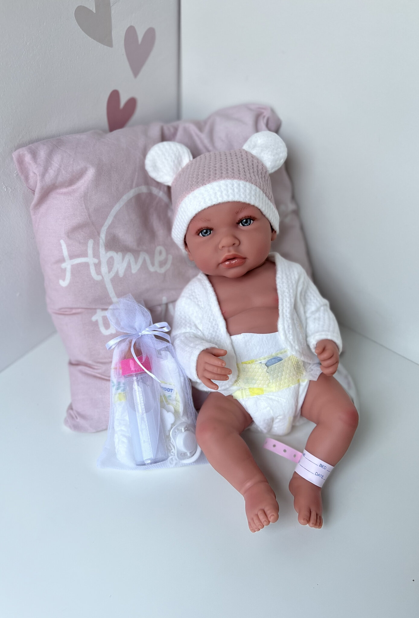 The doll from Marina&Pau is a high-quality Spanish handmade model. The body and limbs are made of high-quality vinyl. The doll has anatomical sexual characteristics (girl) and is suitable for bathing under adult supervision. The set includes a pacifier, a bottle and a diaper. No fragrance. Size: 45 cm Material: high-quality vinyl Scent: no Manufacturer: Marina&Pau Spain