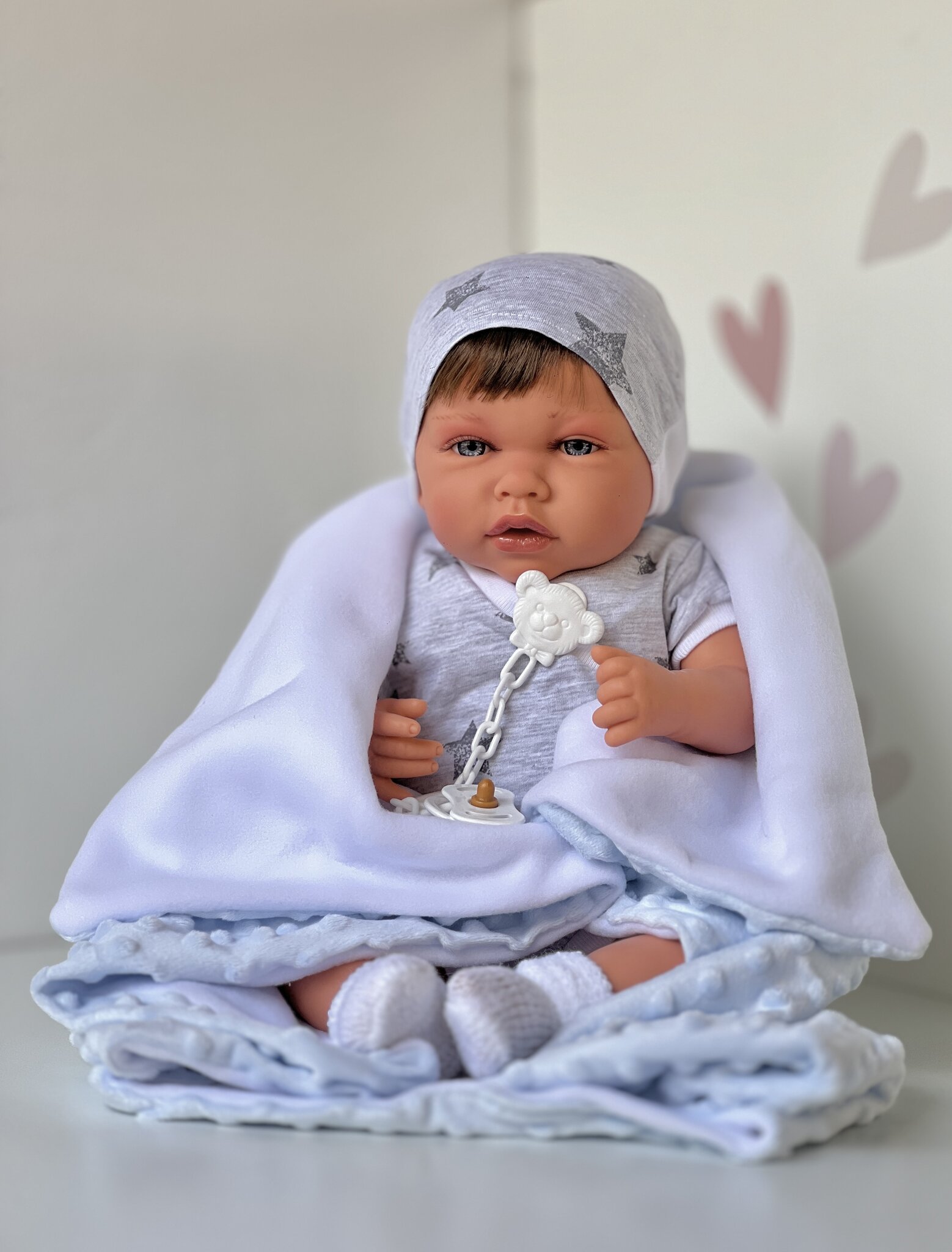 Marina&Pau baby doll is a realistic doll with a soft-stuffed body, 45 cm in size. Included: factory outfit, pacifier and fabric gift bag with the store logo. 100% original with tag and brand on the neck. Without anatomical sexual characteristics and aroma. Parts of the body are movable, bathing is prohibited. Ideal gift for kids and collectors!