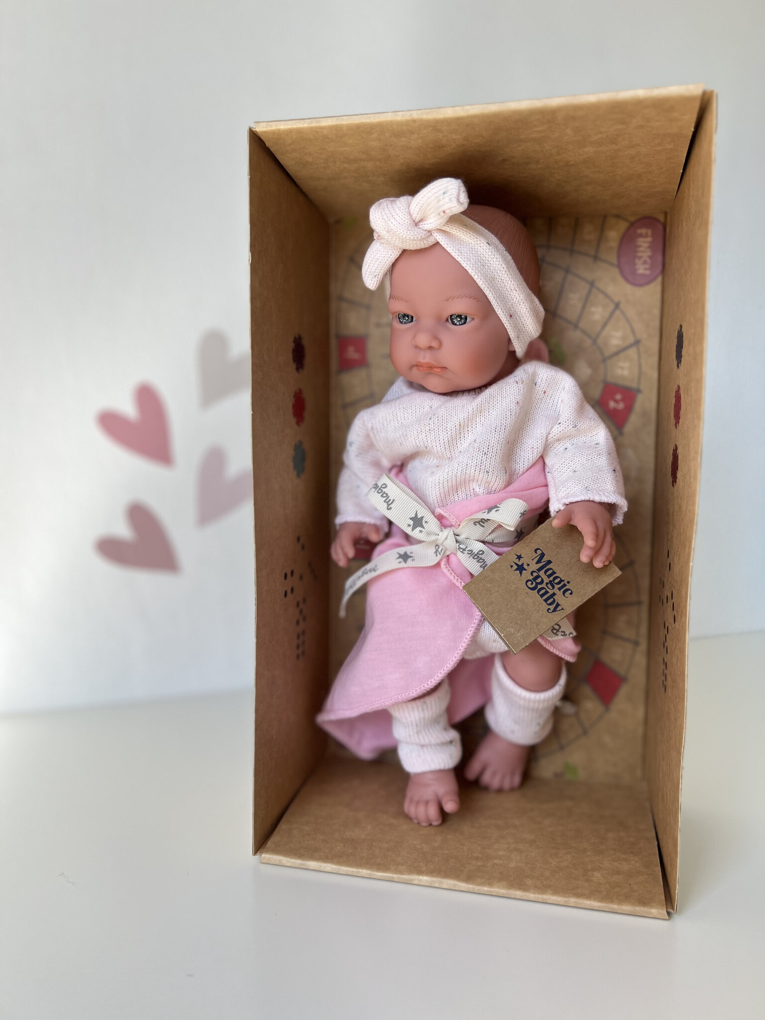 Original Jenny doll from the Spanish factory LAMAGIK Realistic baby with anatomical features and detailed body elaboration. Made of pleasant to the touch vinyl with natural folds, like a real baby. All parts of the body are movable. The doll is scented with a light vanilla scent. She has acrylic eyes with eyelashes that do not close, and painted hair on her head. All clothes are easy to remove. Size: 39 cm Material: high-quality vinyl Aroma: vanilla Manufacturer: LAMAGIK SL, Spain