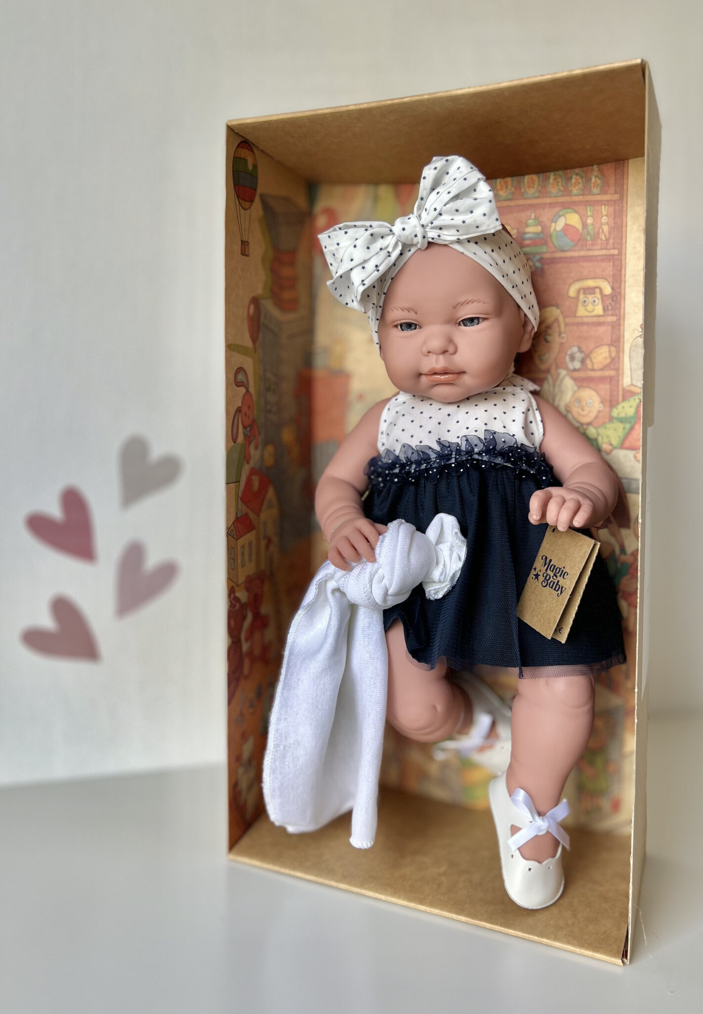 Charming Marina is an exquisite doll, hand-made by Spanish craftsmen. Her expressive face with rosy cheeks and a dimple on her chin looks surprisingly realistic. Eyes with long eyelashes do not close. Detailed. The body is completely vinyl and movable – the doll can sit, lie and change poses. Has a delicate vanilla aroma. Clothes are hand-made from cotton. All elements are removable. Size: 45 cm Material: high-quality vinyl Aroma: vanilla Manufacturer: LAMAGIK SL, Spain