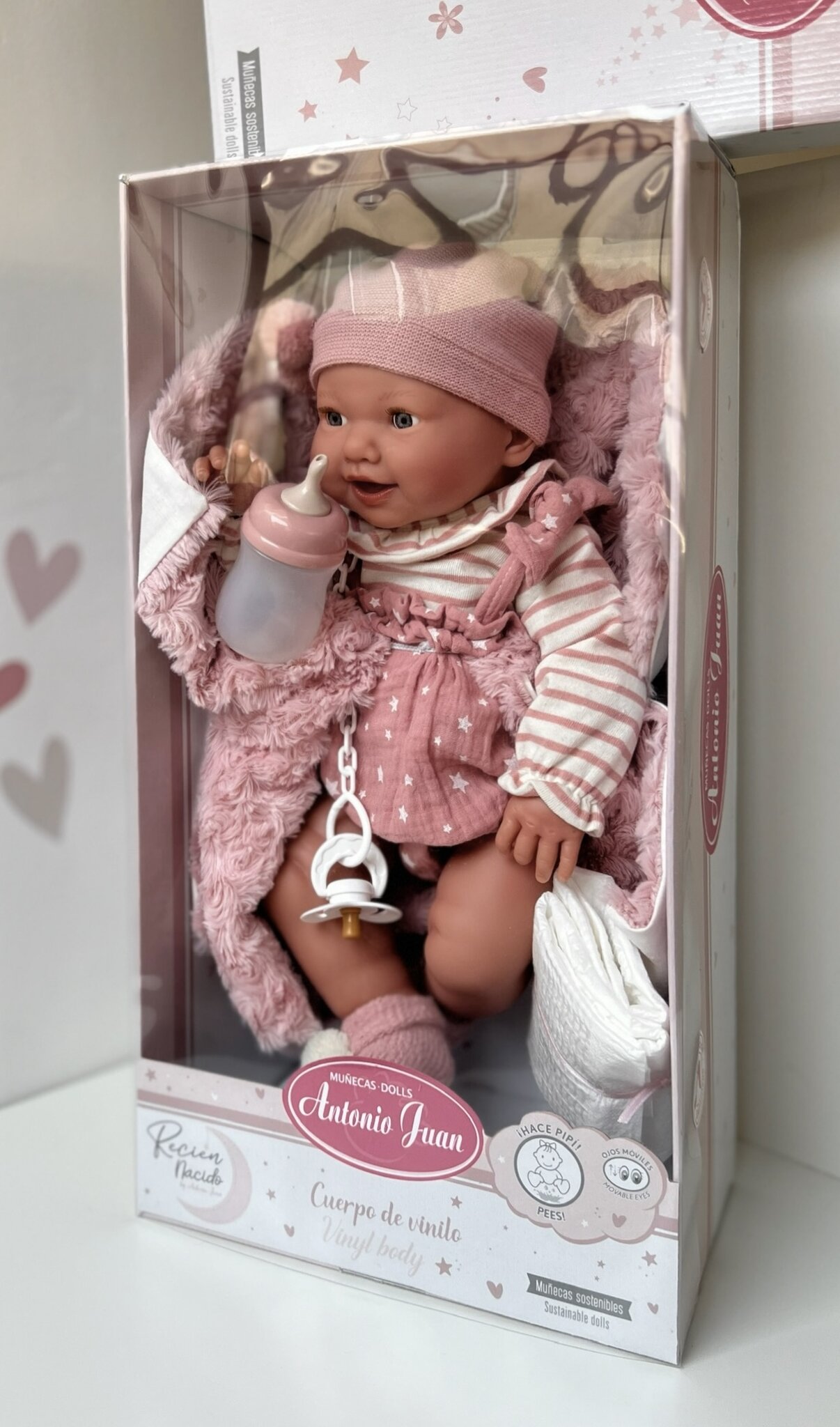 The interactive doll Mia by Antonio Juan is a modern model with a urination function. The doll is 42 cm tall. A smiling face, chubby cheeks and eyes with eyelashes add realism to the image. The head is decorated with a relief pattern imitating children’s hair. The body is made entirely of high-quality vinyl, pleasant to the touch. The arms and legs are movable. The doll can sit and change positions. When laid on its back, the eyes close. After feeding from a bottle, the doll urinates like a real baby. All clothing items are removable. The set includes a bottle, diaper and soft quilted blanket. The doll is packed in a branded Antonio Juan box and is suitable as a gift for any occasion. Size: 42 cm Material: high-quality vinyl Scent: none Manufacturer: Antonio Juan Spain