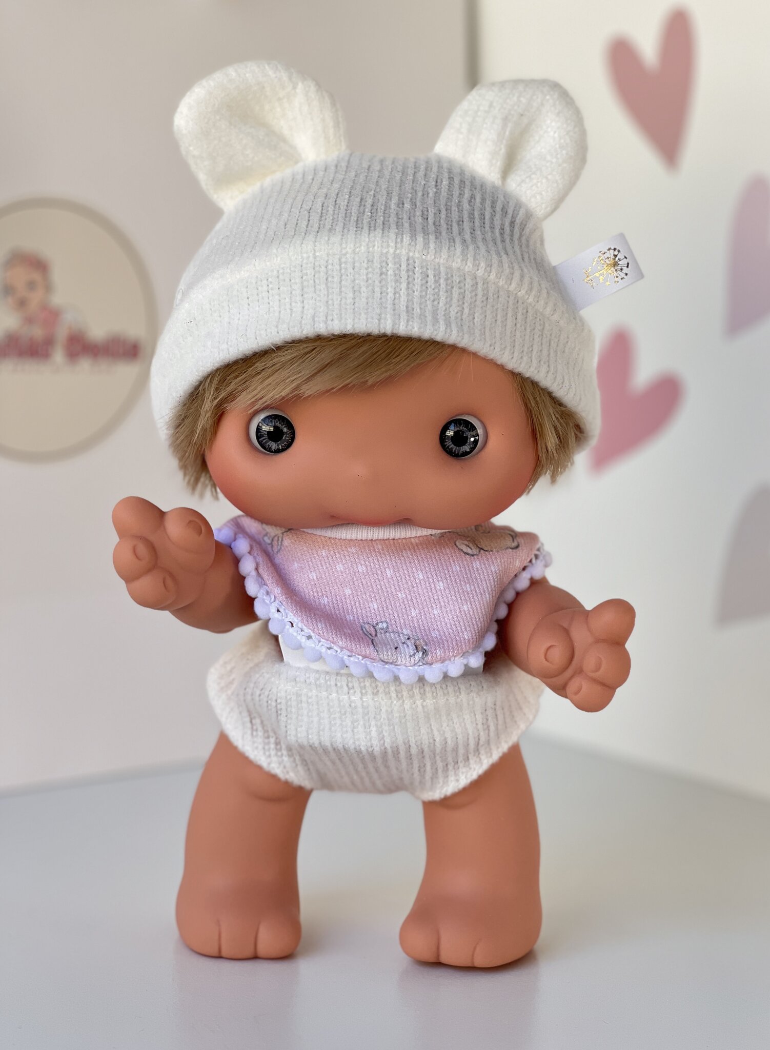 The Piu doll is a humanoid creature with 4 fingers on its hands. The set includes: outfit and gift box. Has a branded tag-passport and a stamp, movable body parts, can be bathed. Size 25 cm, material: vinyl and nylon, manufacturer: Spain (Marina&Pau). Without anatomical sexual characteristics and aroma.