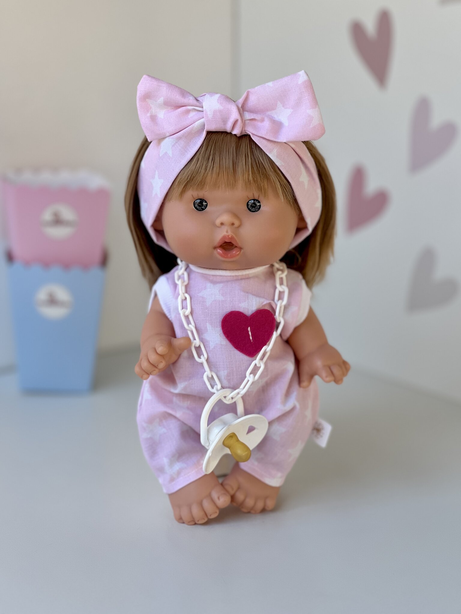 A doll for children from 1.5 years old, 26 cm high, made of high-quality vinyl. The set includes a factory outfit, a pacifier on a chain and a gift box. This is a 100% original product with a passport tag on the garment and a brand on the neck. The doll has anatomical sexual characteristics, movable parts and the ability to bathe. The vanilla aroma lasts for more than 10 years. Manufacturer: Spain (Marina&Pau).