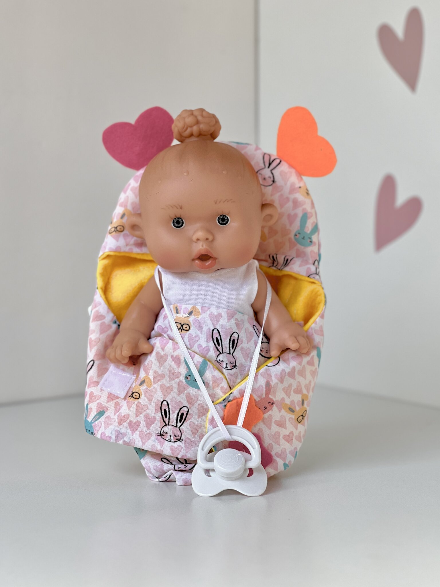 Scented doll, girl, with a bun, in a carrier (rabbits), 21 cm (Marina&Pau)
