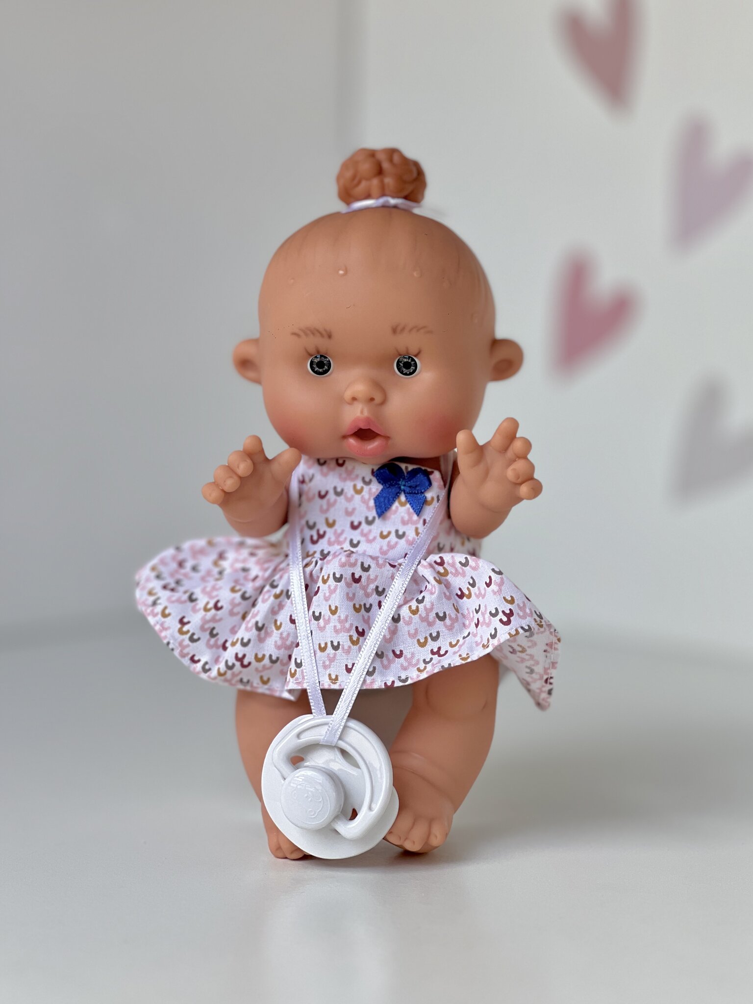 Miniature doll 21 cm high, made of high quality vinyl. The set includes a factory outfit, a pacifier on a ribbon and a gift box. The doll has anatomical sexual characteristics, movable body parts and the ability to bathe. The vanilla aroma lasts for more than 10 years. The originality is confirmed by a passport tag and a brand on the neck. Manufacturer: Spain (Marina&Pau).
