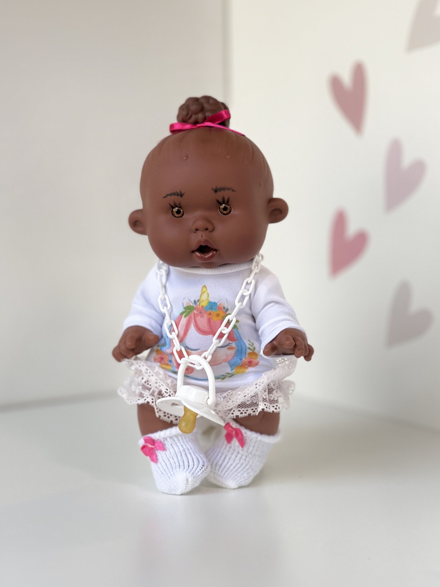 A doll for children from 1.5 years old is an ideal gift! Height 26 cm, made of high quality vinyl. The set includes a factory outfit, a pacifier on a chain and a gift box. The doll has anatomical sexual characteristics, movable body parts and the ability to bathe. The vanilla aroma lasts for more than 10 years. The originality is confirmed by a passport tag on the clothing and a brand on the neck. Manufacturer: Spanish company Marina&Pau.