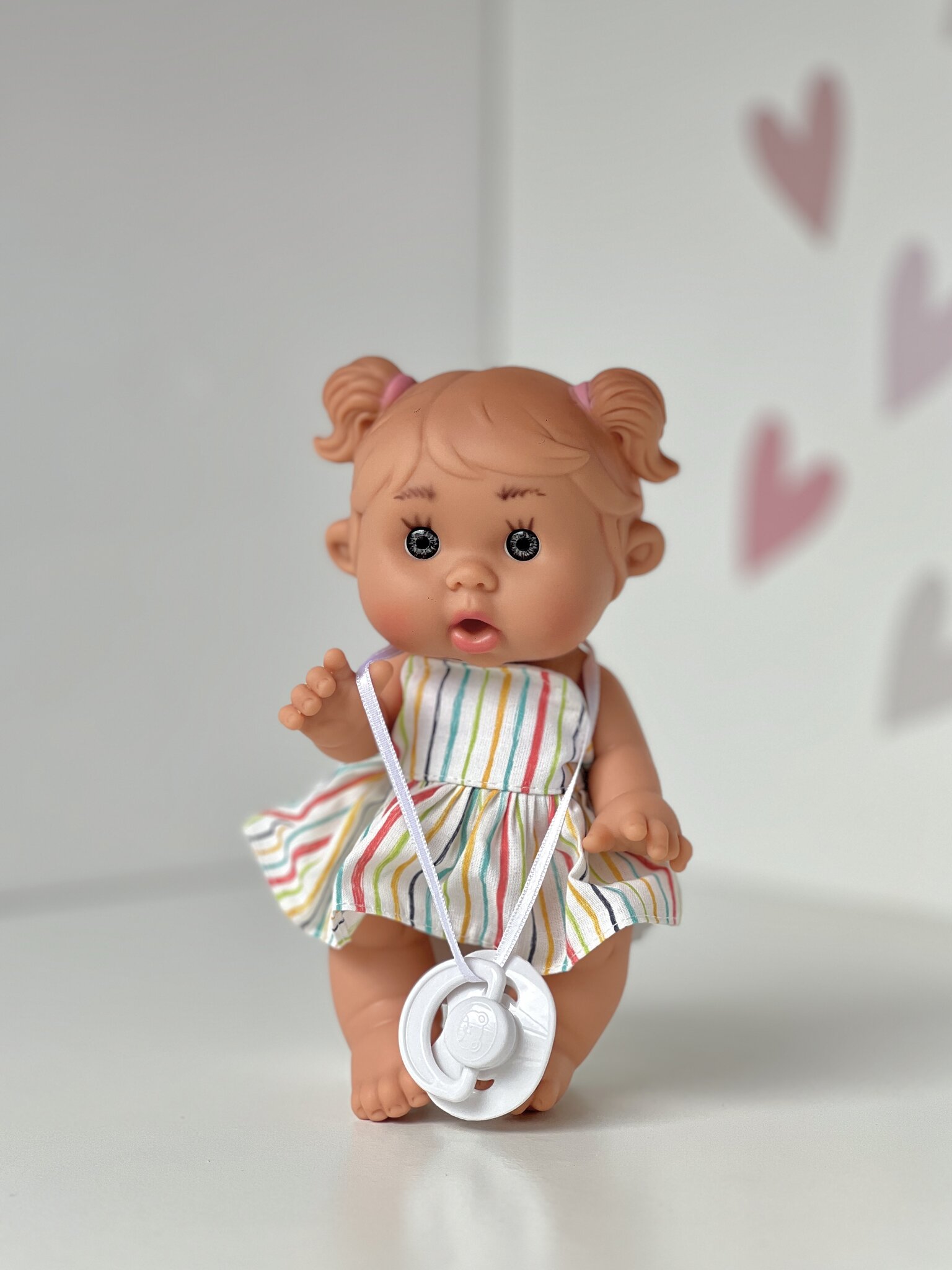 Miniature doll 21 cm high made of high quality vinyl. The set includes a factory outfit, a pacifier on a ribbon and a gift box. The doll has anatomical sexual characteristics, movable body parts and the ability to bathe. The vanilla aroma lasts for more than 10 years. Each doll comes with a passport tag and a stamp on the neck confirming its originality. Manufacturer: Spain (Marina&Pau).
