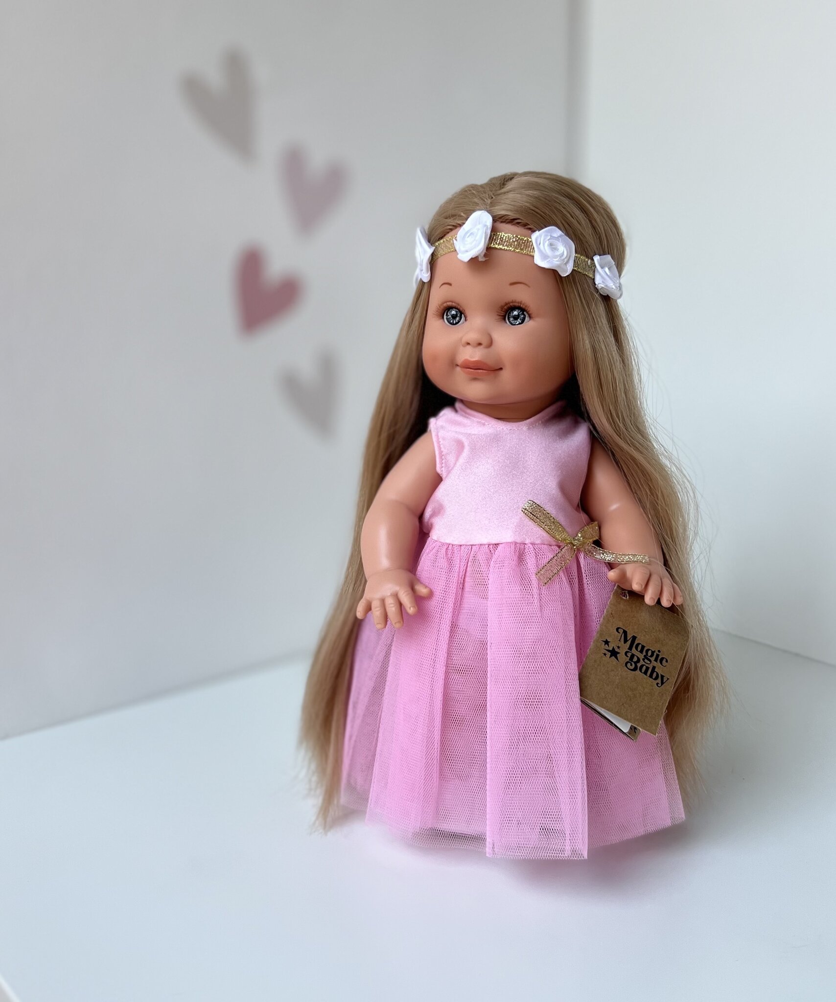 Betty doll by LAMAGIK – charming classic from Spain Cute Betty with dimples on her cheeks is made of pleasant to the touch vinyl. All parts of the body are movable, the doll can stand on its own thanks to straight legs. Without anatomical sexual characteristics. She has hair stitched all over her head (not a wig), acrylic eyes with eyelashes (do not close). The doll is scented – exudes a subtle vanilla aroma. All clothes are removed. Packed in a branded gift box. Size: 30 cm Material: high-quality vinyl Aroma: vanilla Manufacturer: LAMAGIK SL, Spain