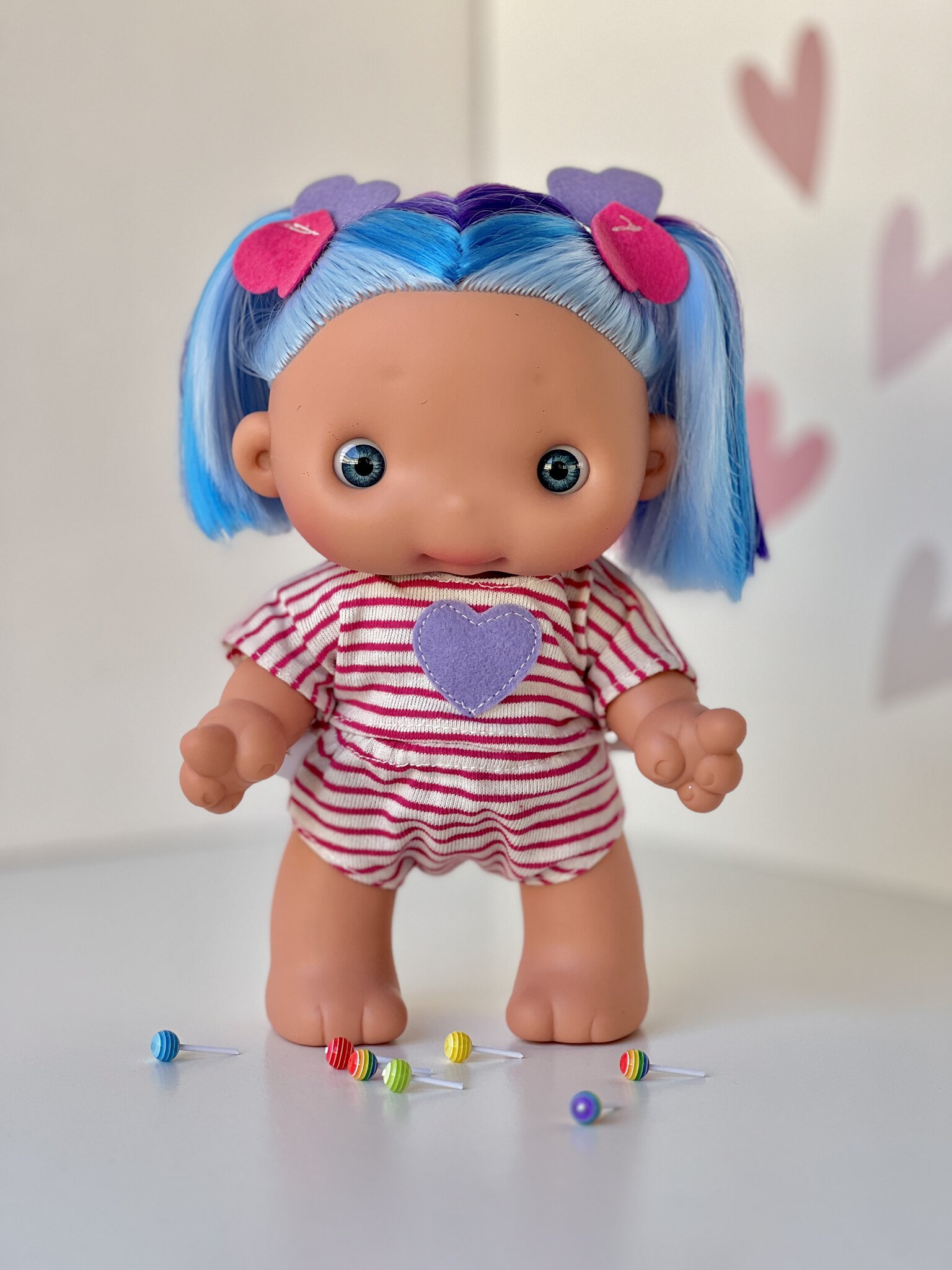 בובת סדרת Piu היא יצור דמוי אדם עם 4 אצבעות, כולל: תלבושת מפעל וקופסת מתנה. בעל תג וחותמת דרכון ממותגים, חלקי גוף ניידים וניתן לרחצה. גודל 25 ס"מ, חומר: ויניל וניילון, יצרן: ספרד. ללא מאפיינים מיניים וארומה אנטומיים.