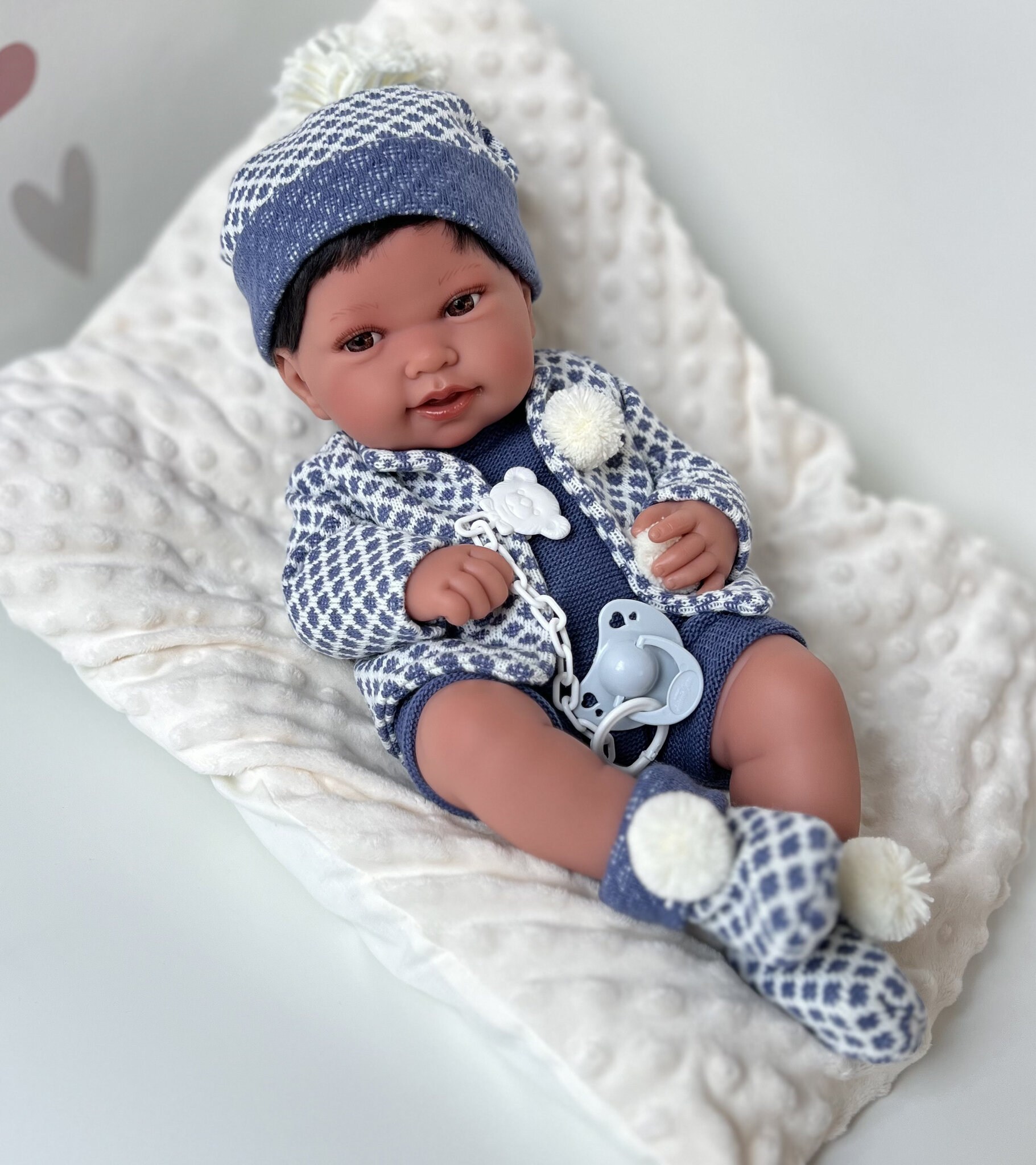 Кукла Pipo от Antonio Juan ростом 42 см выполнена с высокой степенью реалистичности. У куклы есть анатомические половые признаки и пуповина, что делает её максимально приближённой к образу настоящего малыша. Пол куклы — мальчик.Модель изготовлена из гладкого винила, подходит для игры в воде и купания под присмотром взрослых. У куклы глаза с густыми ресницами, не закрываются. Волосы густые, подходят для расчёсывания. Руки, ноги и голова подвижны.Вся одежда снимается. В комплект входят подушка и соска на цепочке с подвеской.